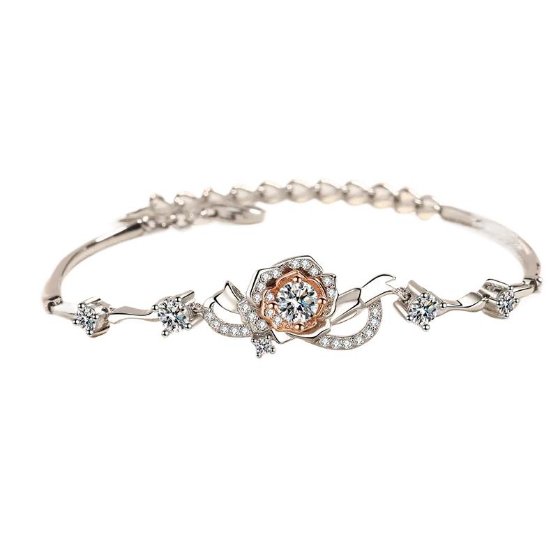 Adoptez une touche d'élégance romantique et tendance avec notre bracelet « Rose », conçu pour la femme moderne qui adore les accessoires féminins et modernes. Fabriqué en argent sterling 925 véritable, ce bracelet est orné d'une magnifique moissanite de 1,4 carat, rehaussée de zirconias 7A étincelantes disposées en un délicat motif floral, offrant un éclat exceptionnel et une beauté captivante.